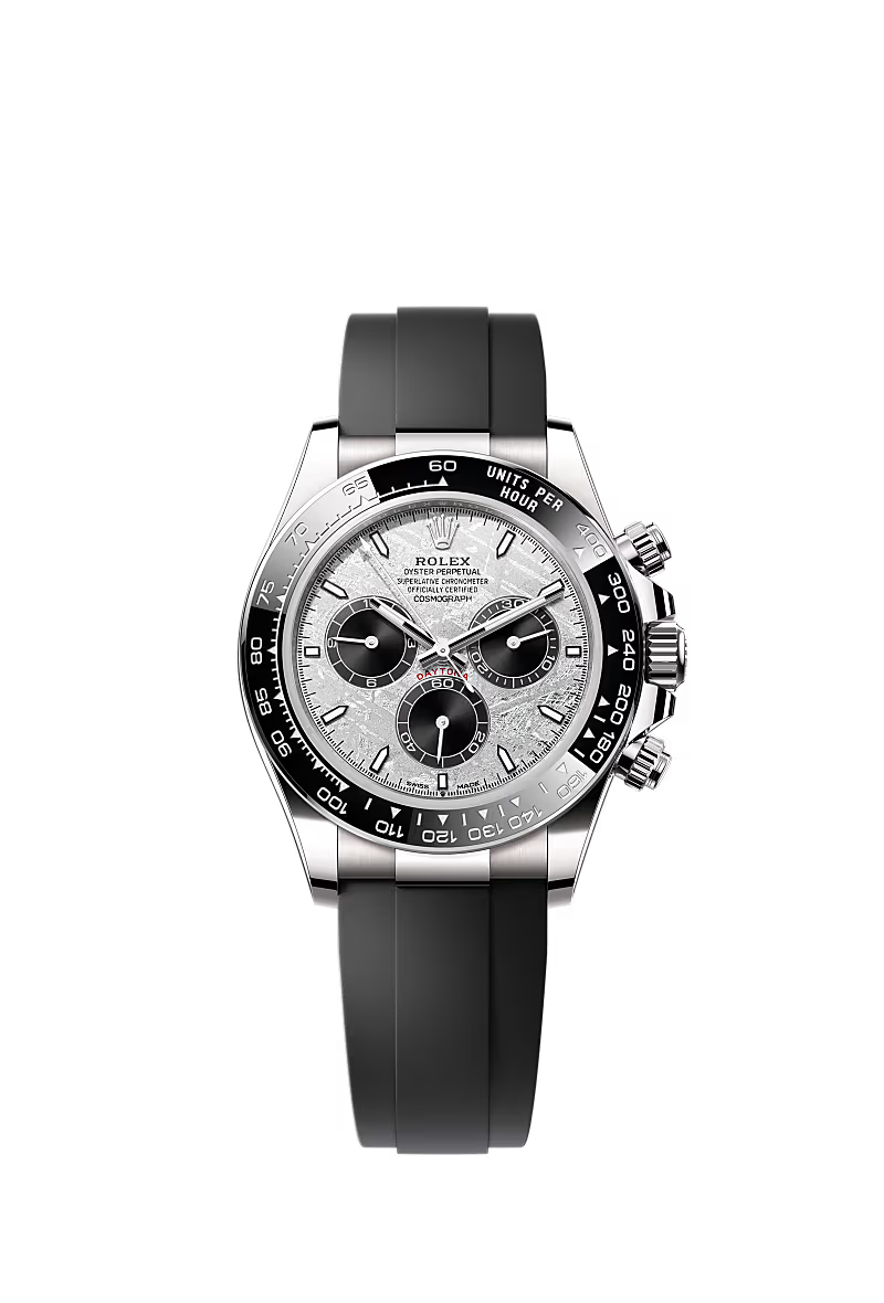 جُهّز إصدار أويستر بربتشوال كوزموغراف دايتونا المصنوع من ذهب أبيض عيار ١٨ قيراطًا بمينا نيزكي وأسود وبسوار أويسترفلكس وبإطار سيراكروم أسود مزوّد بمقياس تاكيمتري.