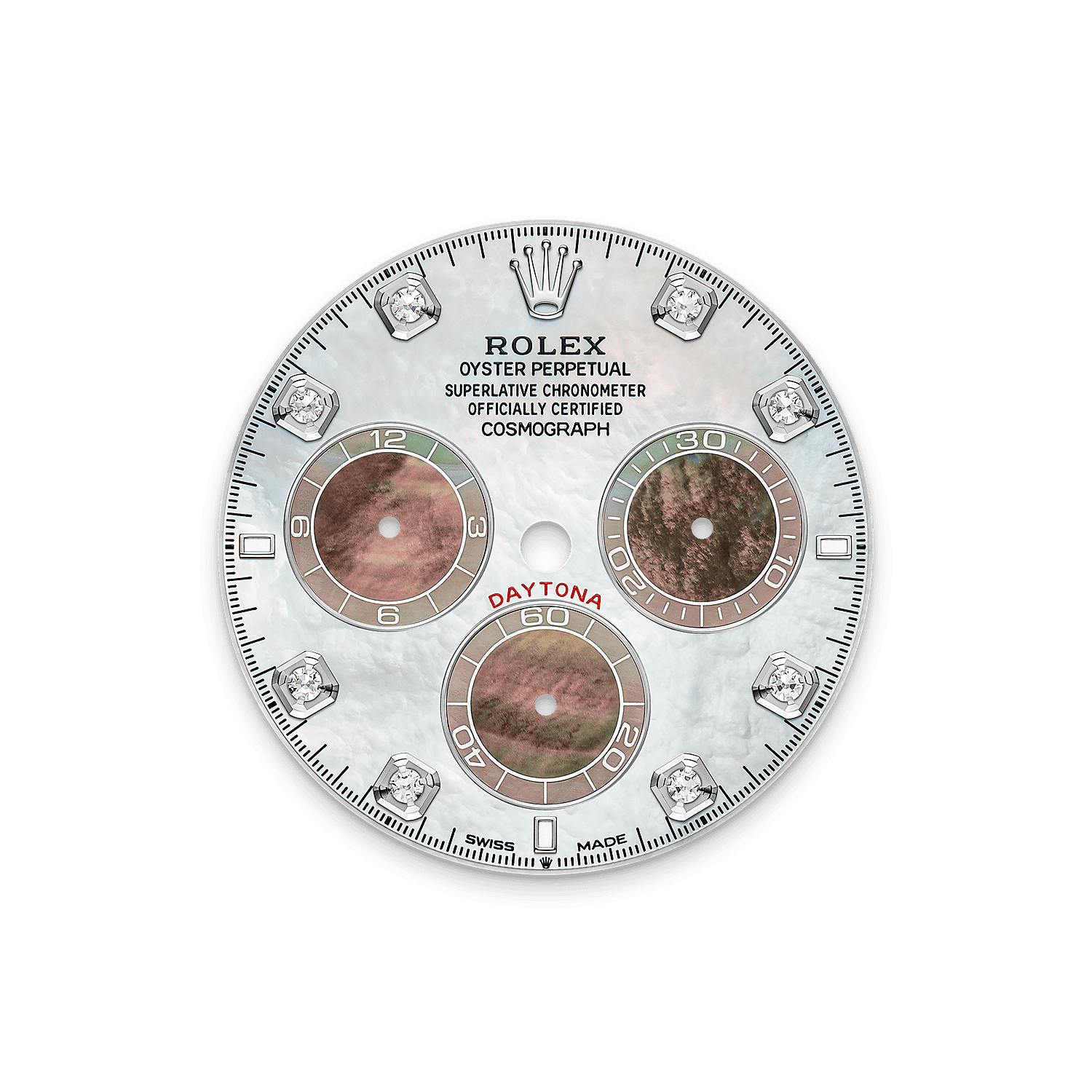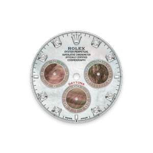 صُنع المينا المتباين من عرق اللؤلؤ الطبيعي والمرصّع بثمانية أحجار ألماس وثلاث علامات ساعات كرومالايت. تُعد حدّة التباين وقوة الألوان وعمق الانعكاسات ثمرة عملية شديدة الصرامة لاختيار المواد. كما يعالج الفنيون العاملون لدى رولكس أنواع عرق اللؤلؤ بعناية فائقة.
