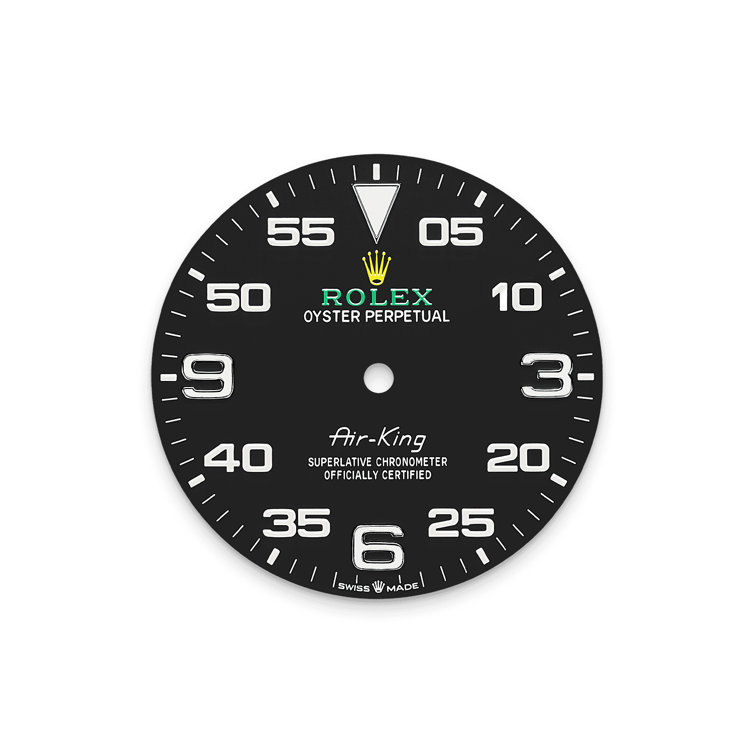 تتألق ساعة إير كينغ بمينا مميّز وعلامات ساعات ٣ و٦ و٩ كبيرة وتدريج دقائق بارز لقراءة فترات الملاحة.