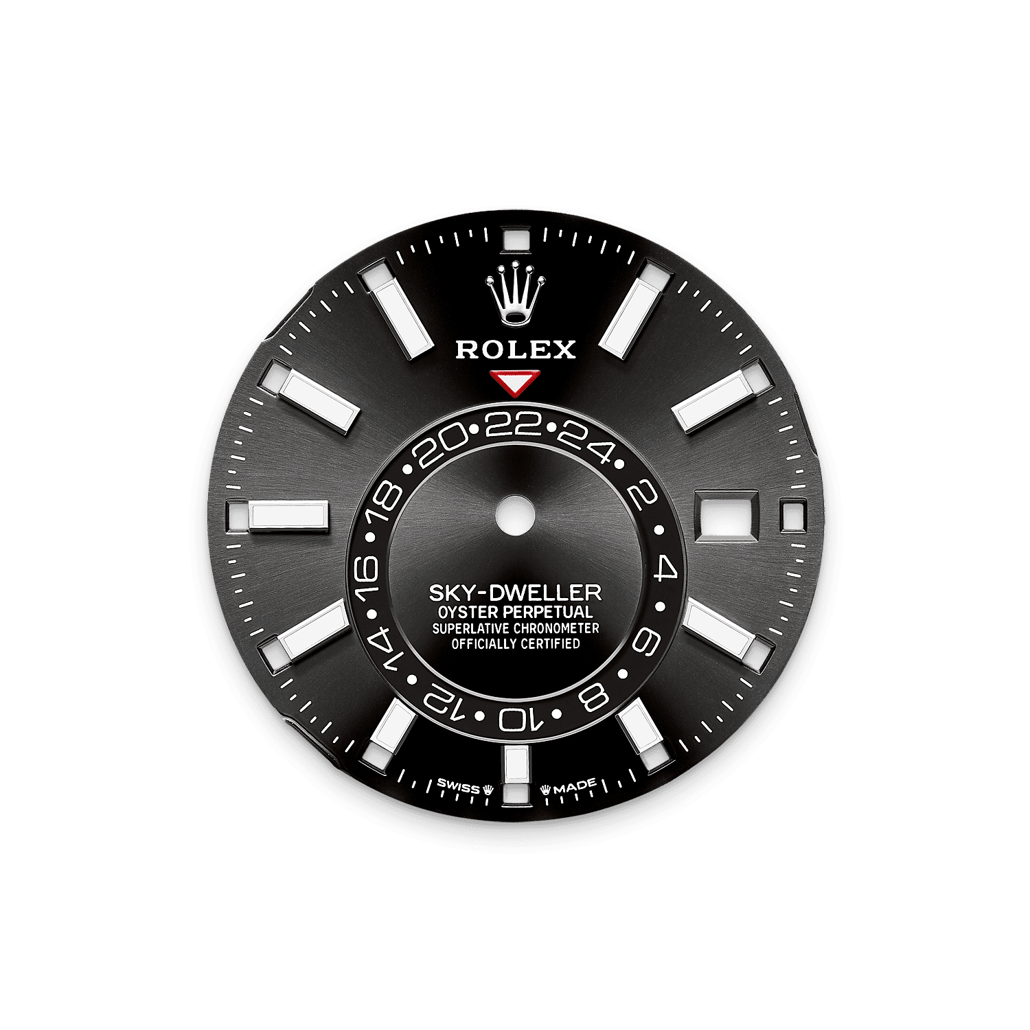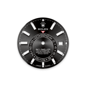 تتميز ساعة أويستر بربتشوال سكاي دويلَر المصنوعة من ذهب أبيض عيار ١٨ قيراطًا بمينا أسود مشرق وبسوار أويسترفلكس.