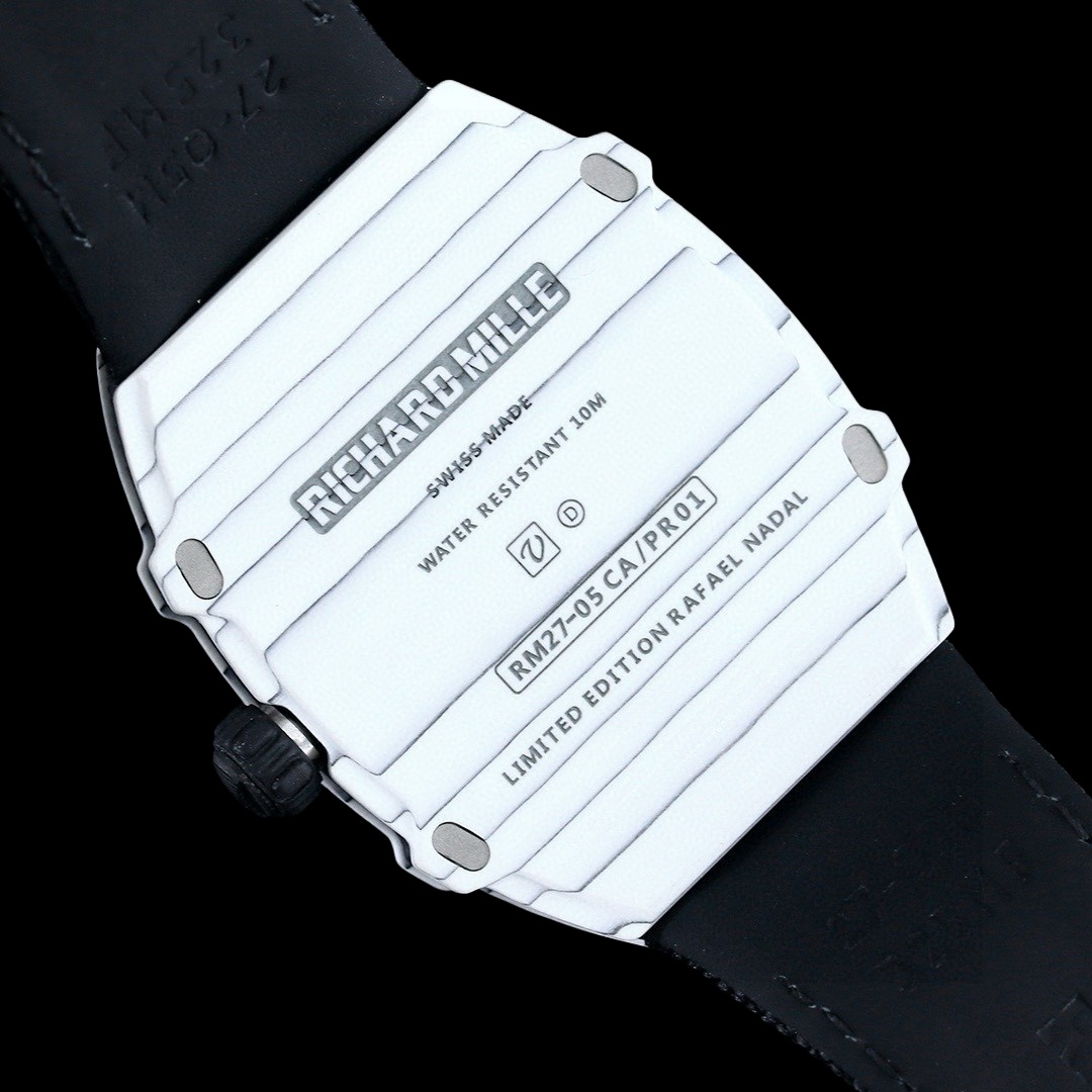 ساعة ريتشارد ميل RM 27-05 فلاينج توربيون رافائيل نادال توربيون العائمة – خفيفة للغاية ورقيقة للغاية. تزن الساعة بأكملها 38 جرامًا فقط (بما في ذلك الحزام)، ويبلغ سمك العلبة حوالي 9 ملم فقط. حجم الساعة الإجمالي: 37.25×47.25×9 ملم. أطلقت ريتشارد ميل للتو عملاً مشتركًا جديدًا رائعًا مع لاعب التنس الشهير رافائيل نادال، وهو ساعة التوربيون العائمة لرافائيل نادال “RM 27-05 Flying Tourbillon”. الساعة بأكملها خفيفة للغاية ويمكنها تحمل تأثيرات التسارع التي تصل إلى 14000 جرام. إنها أخف وأقوى ساعة توربيون في العالم حتى الآن. استغرقت ساعة RM 27-05 هذه 5 سنوات لتطوير مادة مركّبة جديدة من ألياف الكربون – “Carbon TPT® B.4”. هذه المادة عالية التقنية أكثر كثافة بنسبة 4% من الكربون TPT® التقليدي، وتزداد صلابة الألياف بنسبة 15%، وتزداد قوة الراتنج بنسبة 30%. تم تحسين هيكل المادة بشكل متباين الخواص ليظل خفيفًا وقويًا للغاية، مما يوفر أقوى مقاومة للصدمات في هذه السلسلة حتى الآن. تستخدم مرآة الساعة الجديدة بوليمر PMMA خفيف للغاية بدلاً من كريستال الياقوت التقليدي، مما يجعل الساعة بأكملها أخف وزنًا مع توفير شفافية أعلى وأداء مضاد للتوهج. يقدم القرص المجوف المفتوح بالكامل بشكل مباشر الجماليات الميكانيكية الهندسية الفريدة – تشكل لوحة الجسر على شكل حرف V وجبيرة التوربيون تأثيرًا بصريًا مذهلاً، ويظهر البرميل المجوف مباشرة حالة التعبئة، والساعة 2 هي نظام تروس التعبئة، ونظام تروس الساعة 8 مكدس لتكوين اتصال مثالي
