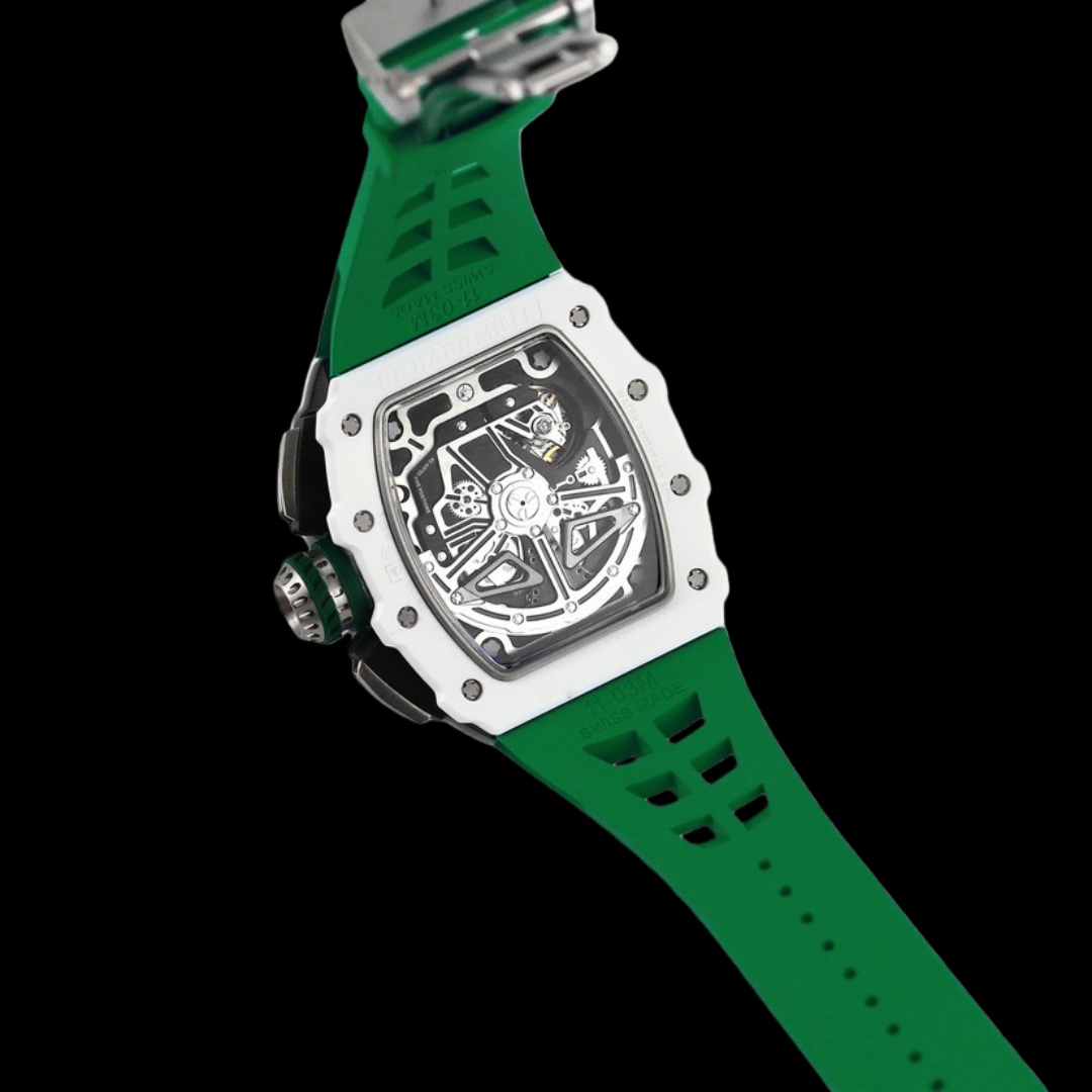 ملاحظة: حزام سلسلة ساعات كرونوغراف ريتشارد ميل RM11-03 [إصدار KU+] مصنوع من الفلورو إيلاستومر مع إدراج رأس التيتانيوم، ومزود بمشبك النسخة الثالثة المقلدة الأصلية، وهو مطابق بنسبة 100٪ للأصل ومتوافق بشكل مثالي مع النسخة الأصلية.