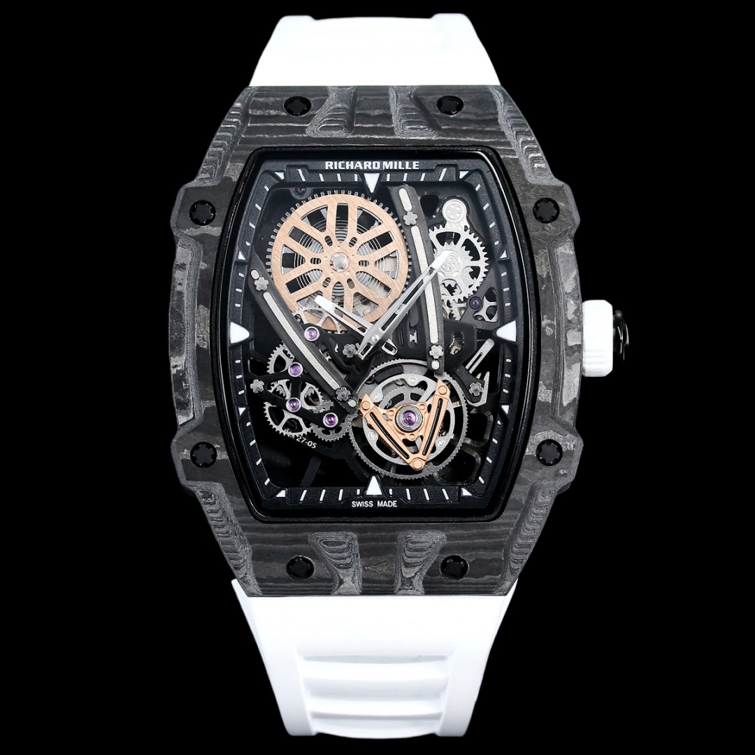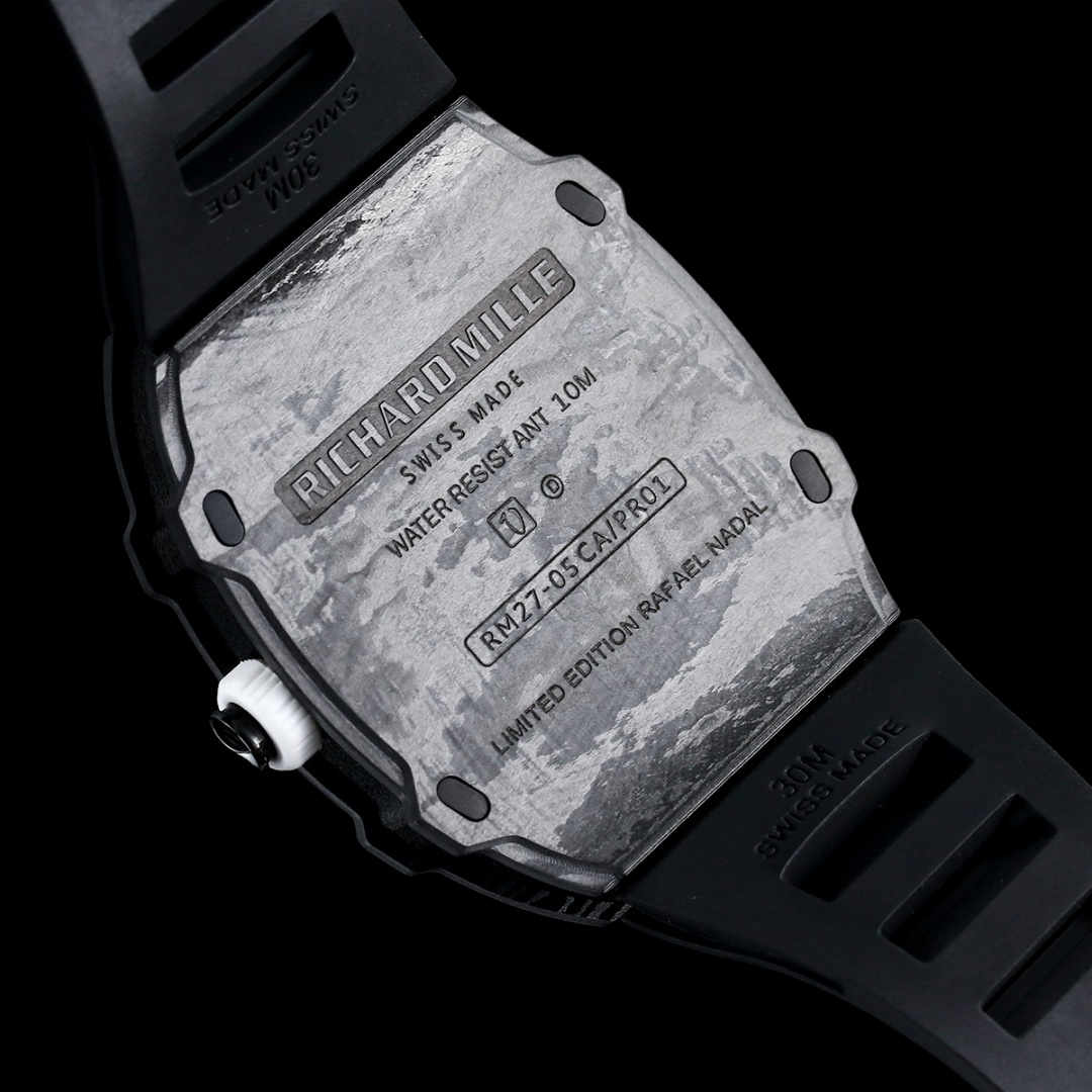 RM 27-05 فلاينج توربيون رافائيل نادال ساعة توربيون عائمة – خفيفة للغاية ورقيقة للغاية. تزن الساعة بأكملها 38 جرامًا فقط (بما في ذلك الحزام)، ويبلغ سمك العلبة حوالي 9 ملم فقط. حجم الساعة بالكامل 37.25×47.25×9 ملم. أطلق ريتشارد ميل للتو منتجًا مشتركًا جديدًا رائعًا مع لاعب التنس الشهير رافائيل نادال – ساعة التوربيون العائمة “RM 27-05 Flying Tourbillon Rafael” Nadal، الساعة بأكملها خفيفة للغاية ويمكنها تحمل تأثيرات التسارع التي تصل إلى 14000 جرام. إنها أخف وأقوى ساعة توربيون في العالم حتى الآن. استغرقت ساعة RM 27-05 هذه 5 سنوات لتطوير مادة جديدة مركبة من ألياف الكربون – “الكربون TPT® B.4”. هذه المادة عالية التقنية أكثر كثافة بنسبة 4% من الكربون TPT® التقليدي، كما تم زيادة صلابة الألياف بنسبة 15%، وزيادة قوة الراتنج بنسبة 30%. وقد تم تحسين هيكل المادة بشكل متباين الخواص ليظل خفيفًا وقويًا للغاية، مما يوفر أقوى مقاومة للصدمات في هذه السلسلة حتى الآن. تستخدم مرآة الساعة الجديدة بوليمر خفيف الوزن PMMA بدلاً من كريستال الياقوت التقليدي، مما يجعل الساعة بأكملها أخف وزنًا مع توفير شفافية أعلى وأداء مضاد للتوهج. يقدم الميناء المجوف المفتوح بالكامل جماليات ميكانيكية هندسية فريدة من نوعها – تشكل لوحة الجسر على شكل حرف V وجبيرة التوربيون تأثيرًا بصريًا مذهلاً، ويظهر البرميل المجوف مباشرة حالة التعبئة، والساعة 2 هي نظام تروس التعبئة، ونظام تروس الساعة 8 مكدس لتكوين اتصال مثالي.