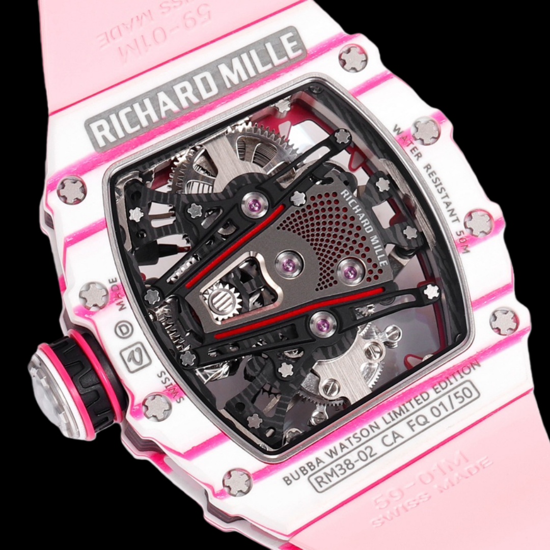 يقدم ريتشارد ميل عملاً جديداً صادماً من حيث التصميم – ساعة RM 38-02 Tourbillon Bubba Watson، التي تم تطويرها بالتعاون مع لاعب الغولف المحترف بوبا واتسون. يتميز الطابع البصري للساعة بلونها الوردي المميز، المستوحى من نادي الغولف المفضل لدى واتسون من علامة PING، مما يمنحها إشراقة حيوية تبعث البهجة في النفس.
