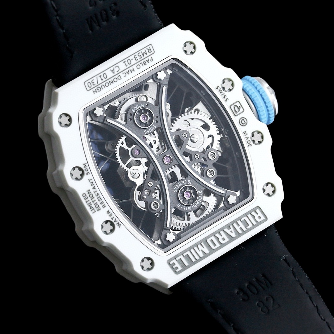 تجمع ساعة RM53-01 بين تصميم الساعة والأحداث الرياضية، لتعكس بشكل مثالي الإيمان الراسخ والروح القتالية العنيدة للرجال الشجعان في الميدان. استنادًا إلى خلفية رياضة الفروسية، يستخدم RM53-01 مجموعة متنوعة من المواد عالية التقنية لمقاومة التأثيرات القوية أثناء التمرين، وبالتالي ضمان عدم حدوث أي ضرر والتشغيل العادي. مصنوعة من مواد عالية التقنية مثل “معدات الحماية”. ساعة توربيون “RM 53-01 PABLO DONOUGH”، بالإضافة إلى ديناميكيتها وحيويتها التي تتمتع بها الساعة الرياضية، تم تجهيزها أيضًا بعلبة صلبة من ألياف الكربون TPT® ومرآة من كريستال الياقوت المصقول وكابل فولاذي معلق يعمل على تثبيت الحركة، مما يقلل بشكل فعال من تأثير التأثيرات الكبيرة والاصطدامات العرضية على الساعة. يمكن أن يطلق عليها واحدة من أكثر الساعات الرياضية الفاخرة “المصنعة” في العالم.