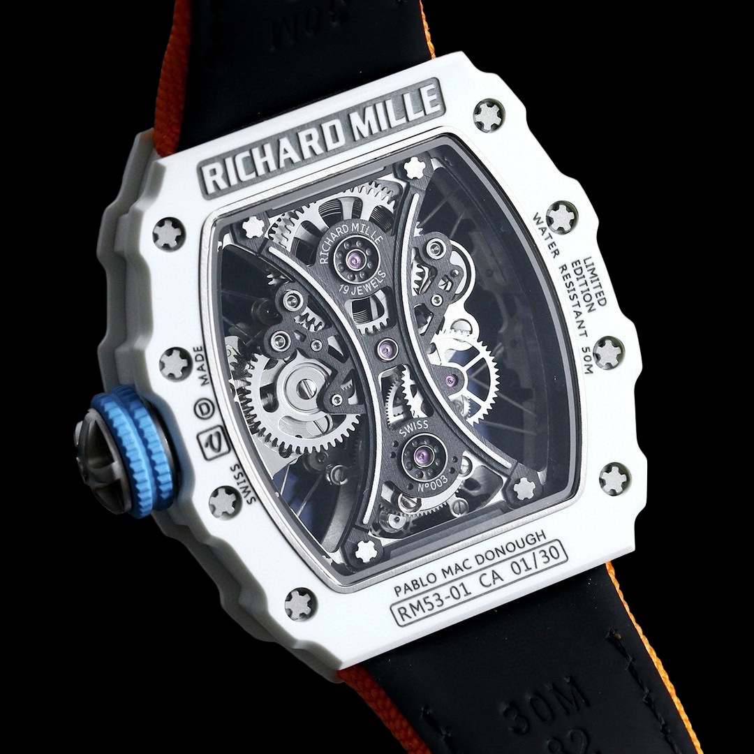 تجمع ساعة RM53-01 بين تصميم الساعة والأحداث الرياضية، لتعكس بشكل مثالي الإيمان الراسخ والروح القتالية العنيدة للرجال الشجعان في الميدان. استنادًا إلى خلفية رياضة الفروسية، يستخدم RM53-01 مجموعة متنوعة من المواد عالية التقنية لمقاومة التأثيرات القوية أثناء التمرين، وبالتالي ضمان عدم حدوث أي ضرر والتشغيل العادي. مصنوعة من مواد عالية التقنية مثل “معدات الحماية”. ساعة توربيون “RM 53-01 PABLO DONOUGH”، بالإضافة إلى ديناميكيتها وحيويتها التي تتمتع بها الساعة الرياضية، تم تجهيزها أيضًا بعلبة صلبة من ألياف الكربون TPT® ومرآة من كريستال الياقوت المصقول وكابل فولاذي معلق يعمل على تثبيت الحركة، مما يقلل بشكل فعال من تأثير التأثيرات الكبيرة والاصطدامات العرضية على الساعة. يمكن أن يطلق عليها واحدة من أكثر الساعات الرياضية الفاخرة “المصنعة” في العالم.
