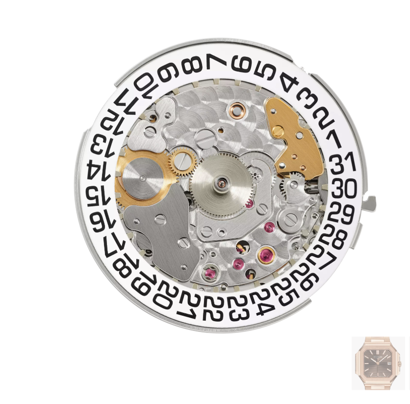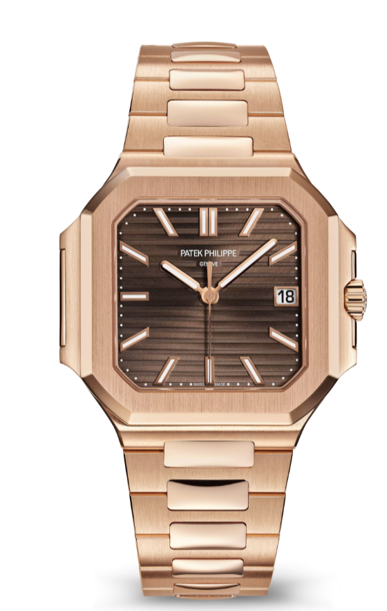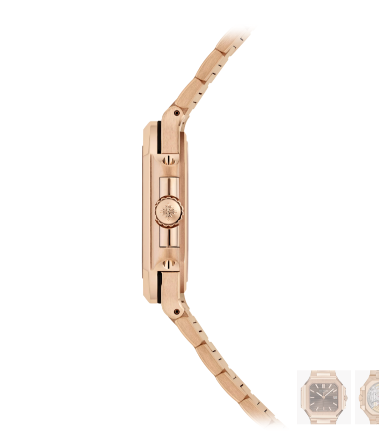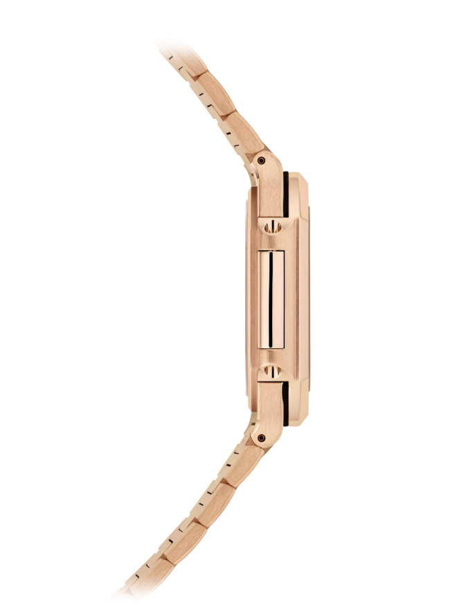 بني مشع، نقش أفقي بارز، مؤشرات ساعات عصوية من الذهب الوردي مع طلاء متوهج أبيض. عقارب عصوية مستديرة من الذهب الوردي مع طلاء متوهج أبيض.
