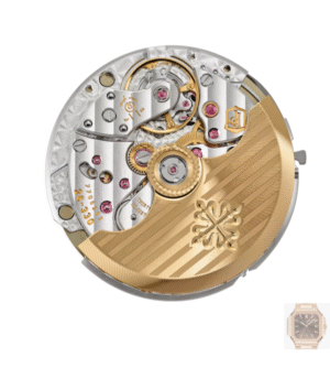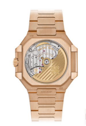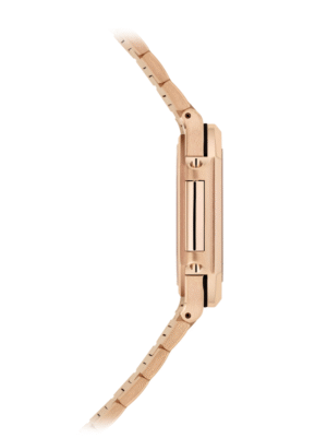 ذهب وردي. القطر (من 10 إلى 4 على مدار الساعة): 40 ملم. السماكة: 8.5 ملم. مقاومة للماء حتى 30 متر. تاج ملولب. ظهر علبة من كريستال الزفير.