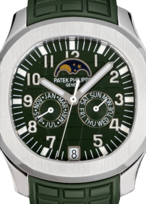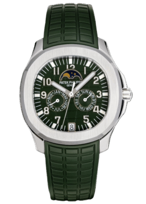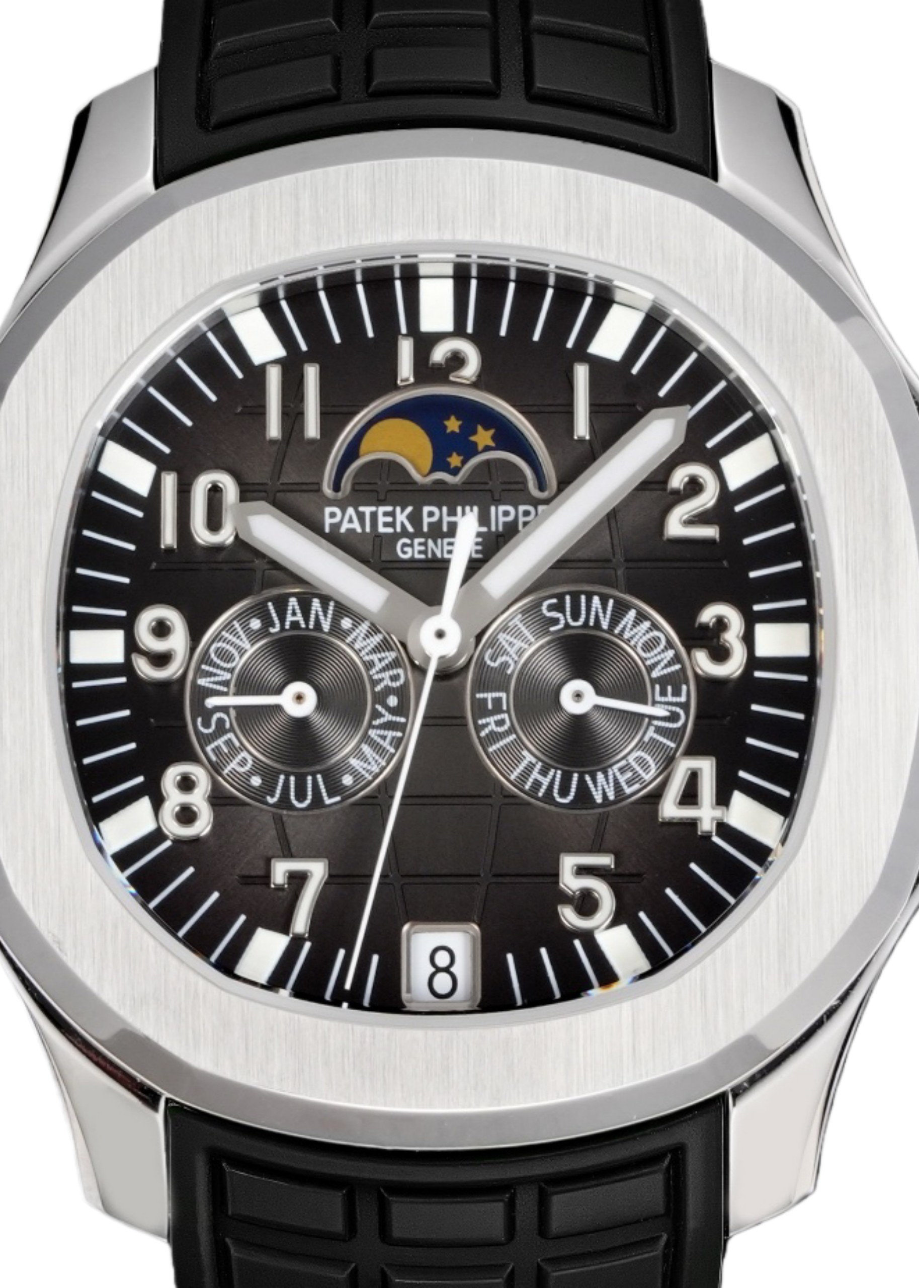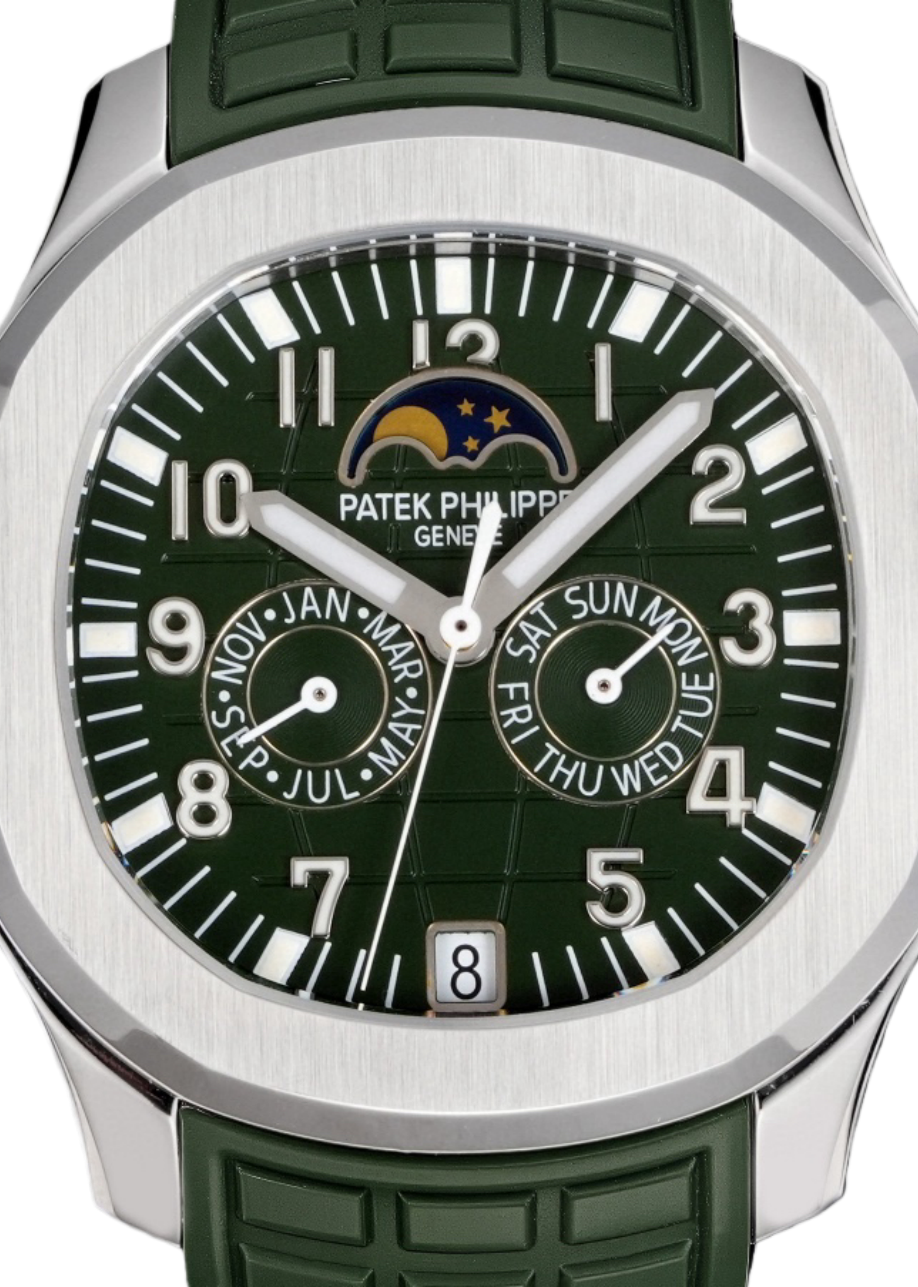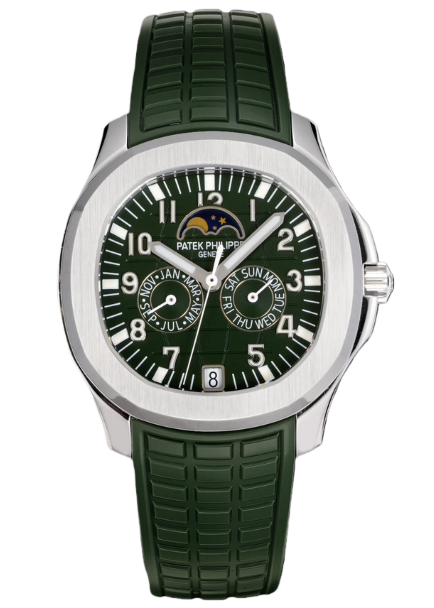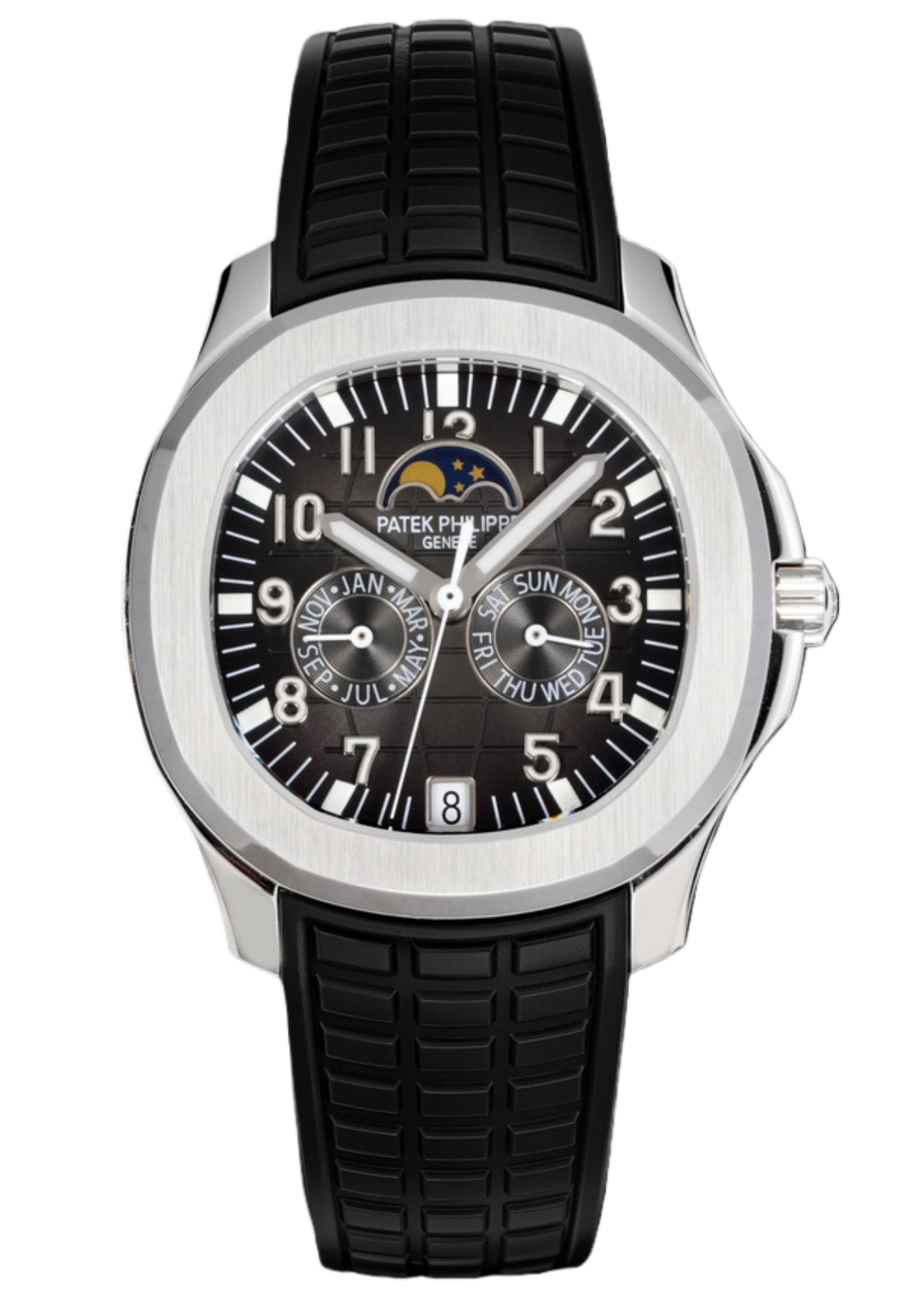 百达翡丽 5261R-001:最新款男女皆宜的笑脸腕表!百达翡丽 Aquanaut 系列推出首款全新舒适实用、功能复杂的腕表——5261R,再次展现休闲优雅的魅力!这款👍年历腕表采用 39.9 毫米表壳,搭载全新进口 9015 机芯,这是一款全自动上链机芯,精准无比。✌️与其他同样具备年历功能的百达翡丽腕表相比,这款腕表尤为独特。日期和月相显示窗口分别位于 6 点钟和 12 点钟位置,星期和月份小表盘则分别位于 3 点钟和 9 点钟位置。👌表壳和表圈采用八角拱形设计,并饰以对比鲜明的抛光和缎面拉丝工艺。灰蓝色表盘和表带上饰有 Aquanaut 浮雕图案,阿拉伯数字时标和棒状指针均覆有白色荧光涂层,确保清晰易读。这款腕表搭配灰蓝色表带,不仅佩戴起来非常舒适,而且非常耐用。表带上饰有Aquanaut图案,与表盘的装饰相得益彰,并配有折叠表扣,更添休闲优雅气息!