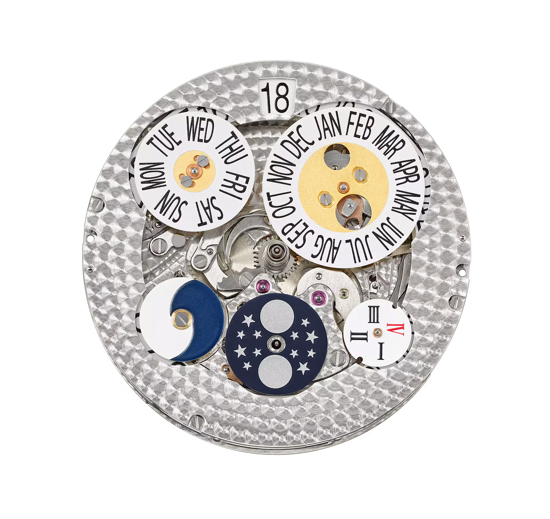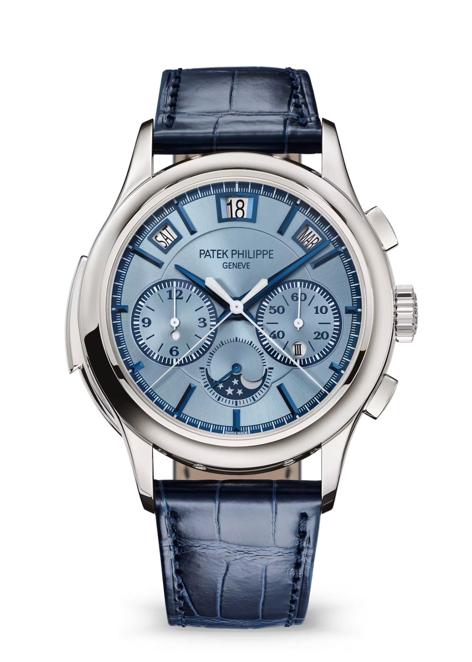 لون أزرق جليدي مشع، مؤشرات ساعات مطلية بالذهب الأبيض مع حواف مقطوعة. قاعدة من الذهب عيار 18 كيلو. عقارب مطلية بالذهب الأبيض بتصميم دوفين مشطوفة الحواف.