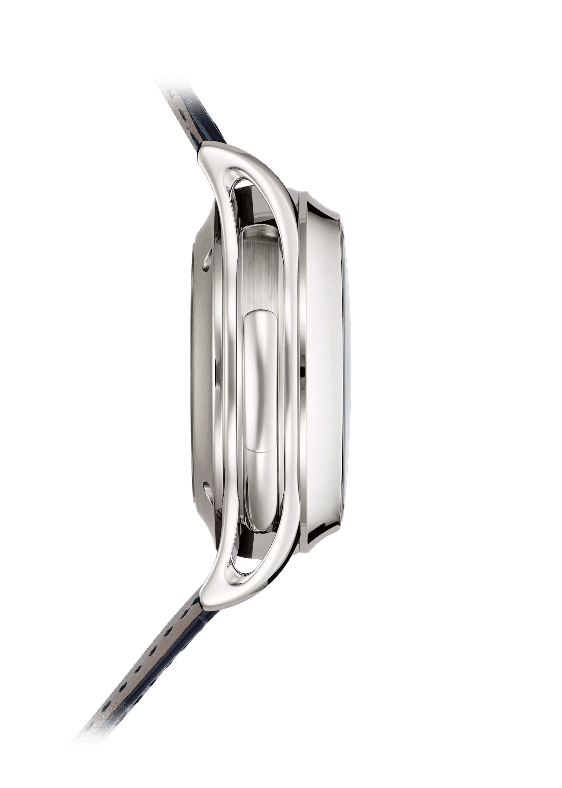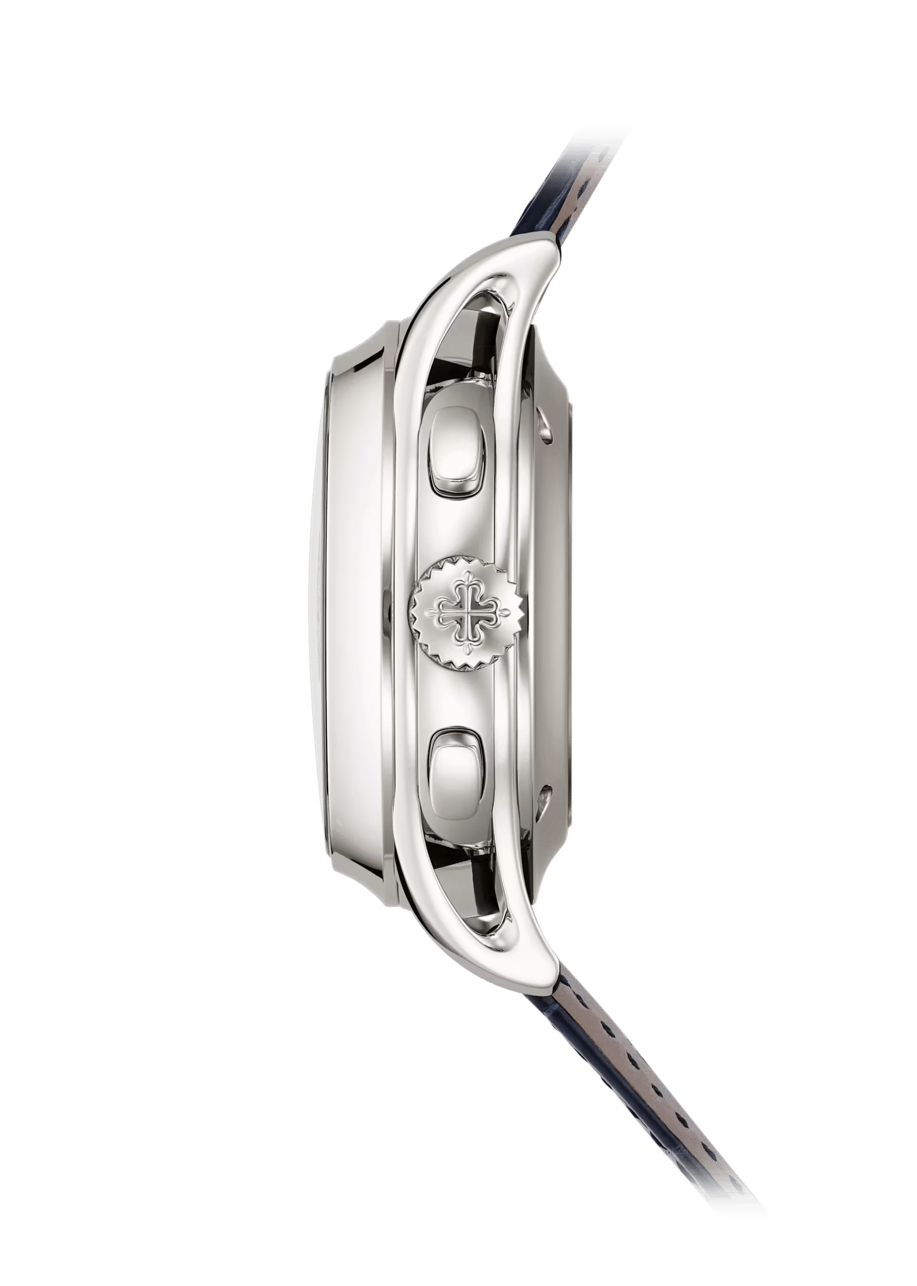 جلد تمساح بحراشف مربعة، أزرق بحري لامع. إبزيم ذهب أبيض ثلاثي الشفرات قابل للطي مُحَمَّى ببراءة اختراع.