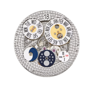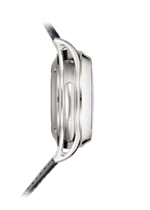 ذهب أبيض. أذن علبة مفرغة. القطر: 42 ملم. السماكة: 17.71 ملم. محمية من الرطوبة والغبار فقط (غير مقاومة للماء). قابلية تبديل ظهر العلبة الصلب وظهر الكريستال الزفير.